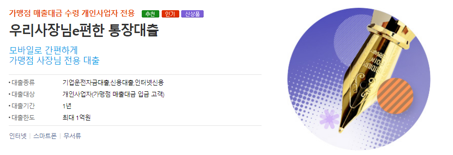 바쁘신 사장님들을 위해 모바일로 간편하게 진행이 가능한 상품으로 가맹점 사장님에게 꼭 필요한 전용 대출 상품 입니다. 우리은행으로 이용하는 개인사업자 전용 통장대출입니다. 하단에서 상세하게 알아보겠습니다.