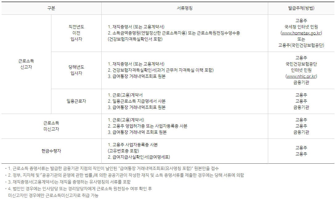 근로자의 경우는 주민등록등본과 재직 및 근로소득 확인서류가 필요 합니다. 하단의 표를 참고 해주시기 바랍니다.