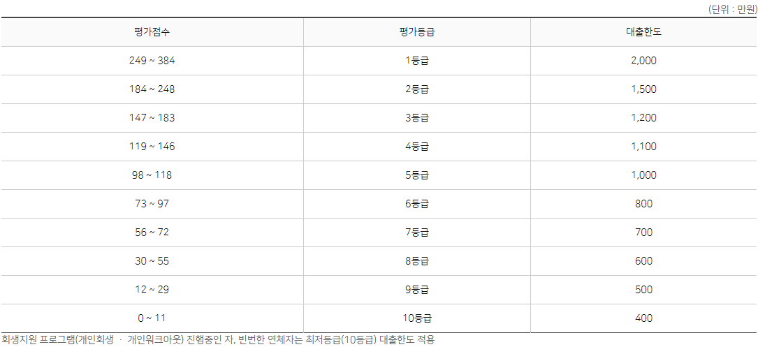 [햇살론 소상공인 평가표]에 의한 점수별 등급 이내 1등급 : 2천만원이내~ 10등급 : 4백만원이내 |