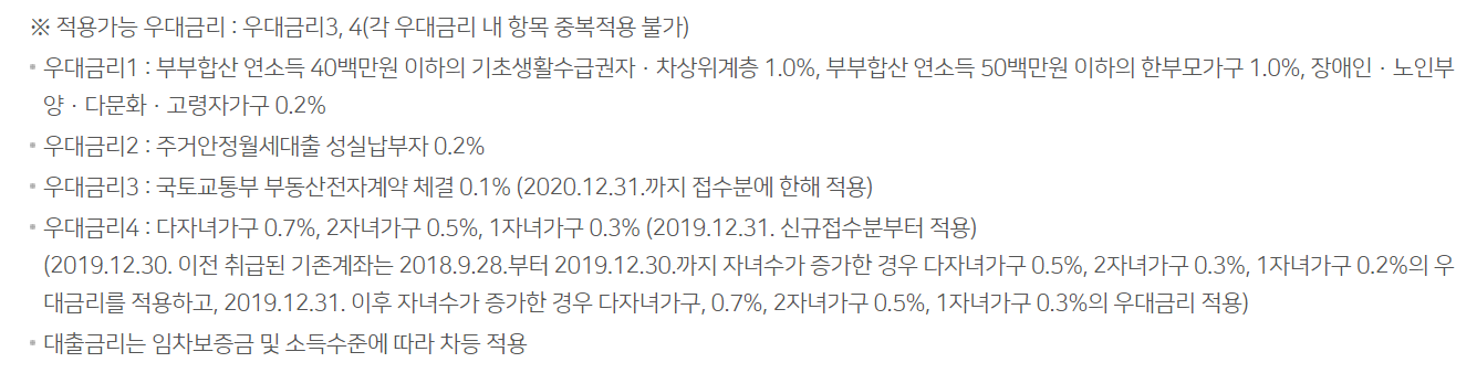 4. 부부합산 연소득이 5,000만원 이하 고객(신혼가구, 혁신도시 이전 공공기간 종사자, 타 지역으로 이주하는 재개발 구역내 세입자, 다자녀가구, 2자녀가구인 경우 6,000만원 이하. 단, 중소기업 취업 청년 세대주인 경우 5,000만원(외벌이가구 또는 단독세대주인 경우 3,500만원) 이하, 청년전용보증부월세대출 신청고객은 2,000만원 이하