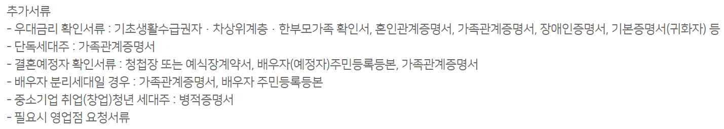 -중소기업 취업(창업)청년 세대주 : 사업등록증(사본), 고용보험자격이력내역서(근로자용), 소득기업 주업종코드 확인서