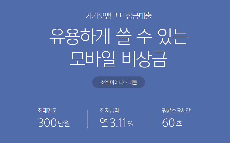 첫 번째로 안내드릴 상품은 많은 분들이 사용하고 계시는 인터넷은행이면서 1금융권이기에 대출에 대한 부담이 없는 카카오뱅크 비상금대출 상품 입니다. 모바일로 간편하고 빠르게 진행되는 대출이 큰 장점 입니다.