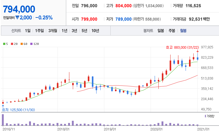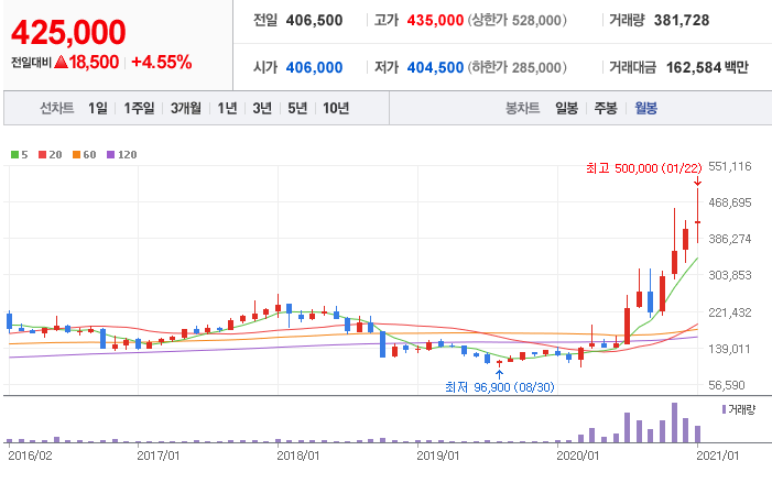 미국과 유럽에서 바이오시밀러의 판매가 호조를 보이고 있고 코로나19 항체 치료제 렉키로나주의 수출이 본결화 될 것으로 전망되면서 높은 실적 성장세를 보일 것으로 예상되는 종목으로 큰 관심을 보이고 있습니다.