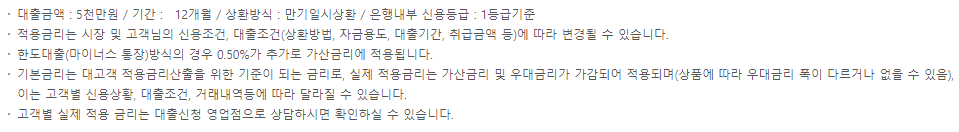 - 만기일시상환 및 한도대출 : 1년 이내 약정(최장 5년까지 기간연장 가능)