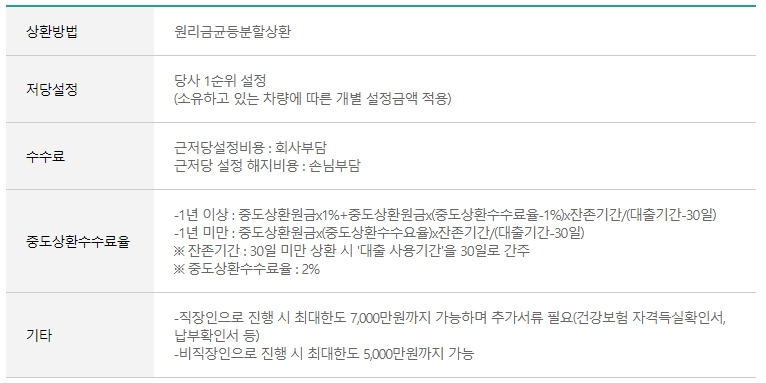 위의 현대캐피탈 상품과 비교 해보면 금리뿐만 아니라 중도상환수수료가 발생하는 상품 입니다. 해당 부분을 잘 참고 해주시기 바랍니다.