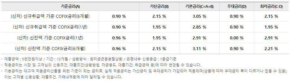 대출금리는 하단의 표와 같습니다. 적용금리는 시장 및 가입자 신용조건, 대출조건에 따라 달라 질 수 있습니다.