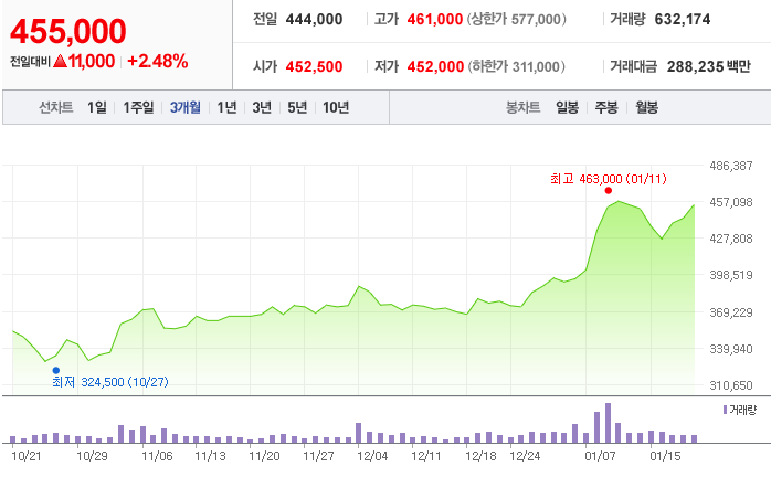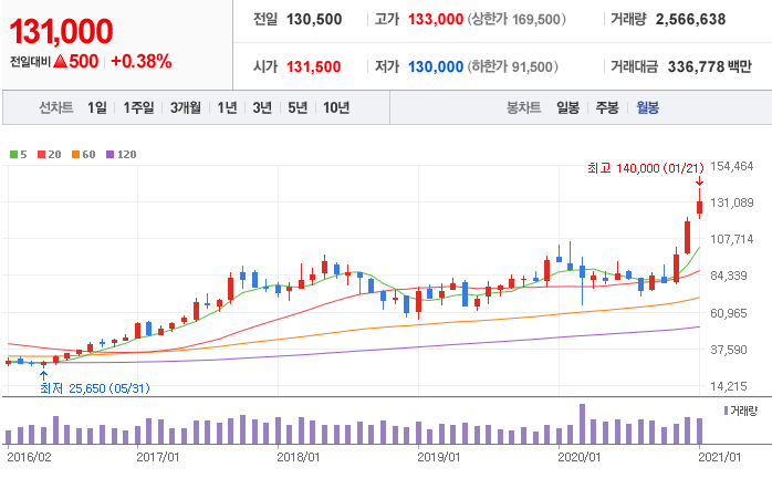 애플카의 생산설로 기아차로 역대 최고가를 갈아치우고 있습니다. 아직 결정된 공식적 입장이 없다고 말하고 있지만 개인투자자들이 몰리고 있습니다. 하지만 위와 같은 이유 외에도 친환경 전기차가 전세계적으로 시작되고 있어 자동차산업이 지속적으로 기대되는 종목입니다.