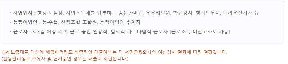 - 자영업자(행상/노점상, 사업소득세를 납부하는 방문판매원, 우유배달원, 학원강사, 행사도우미, 대리운전기사 등)