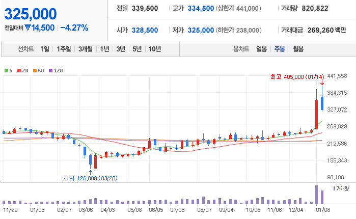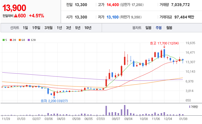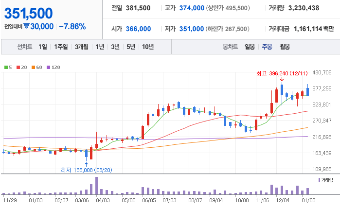 | 20년 9월 작년 대비 매출액 - 4.1% 감소, 영업이익 - 53.3% 감소, 당기순이익 - 83.7% 감소 애플카 개발 및 생산에 관하여 현대차와 협력한다는 내용 발표로 관심이 집중되는 종목 |