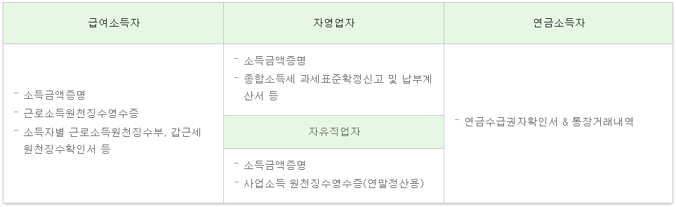 -급여소득자 : 건강보험자격득실확인서, 국민연금가입자 가입증명, 재직회사 발행 재직증명서 등